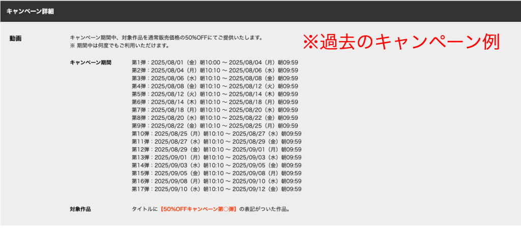 FANZAでは定期的にセールが開催されています。50%OFFは当たり前、タイミングによっては70%OFF以上になることも。特に年末年始・GW・お盆の大型連休前後は大規模セールが狙い目です。